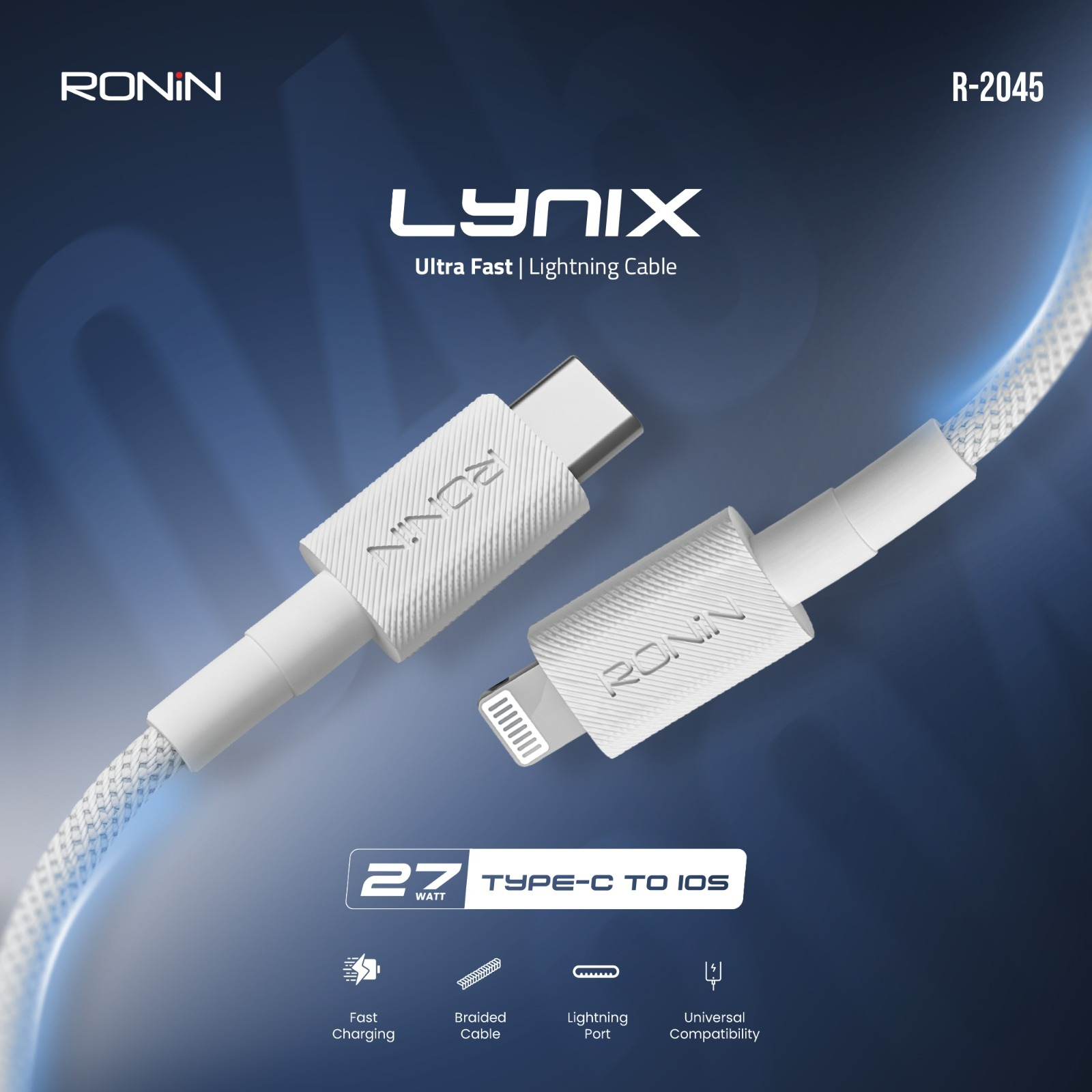 Ronin Lynix | R-2045 Type-C to iPhone Cable This cable is made for Apple users who want very fast charging. It connects any USB-C charger or port to your iPhone or iPad’s Lightning port. It supports 27 Watt Power Delivery (PD), which means your device charges at the fastest speed possible. With this cable, your iPhone or iPad will charge much quicker than with normal cables.